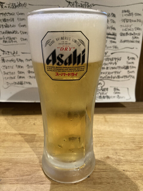 カウンター席に案内され、まずは生ビールで乾杯(⌒▽⌒)