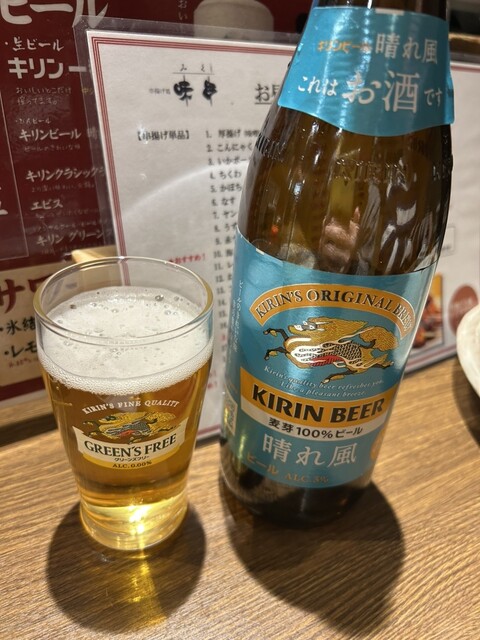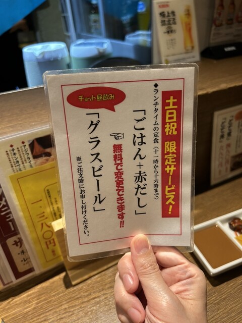 こちらは串揚げの専門店となります。メニューの中に串10本の定食があります。こちらの定食、何とご飯と赤だしをグラスビールへと変更可能。こちらを注文しグラスビールへと変更してもらいました。