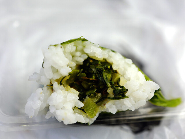手塩をつけるのじゃなく、ある程度、形を作ったところで塩を満遍なくふりかけていく。それを軽く握っていくのが独特。めはりはそれを高菜漬けでまいて仕上げる。
