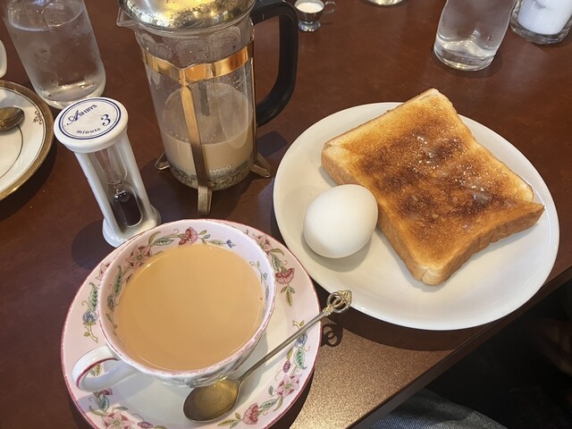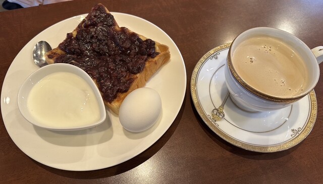 【料理について】モーニングB(小倉あんトースト、ゆで卵、バナナヨーグルト)、アイスカフェオレどれも非常に美味しかった。卵:...