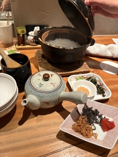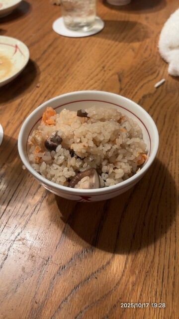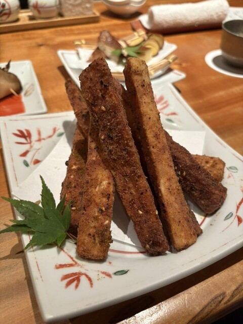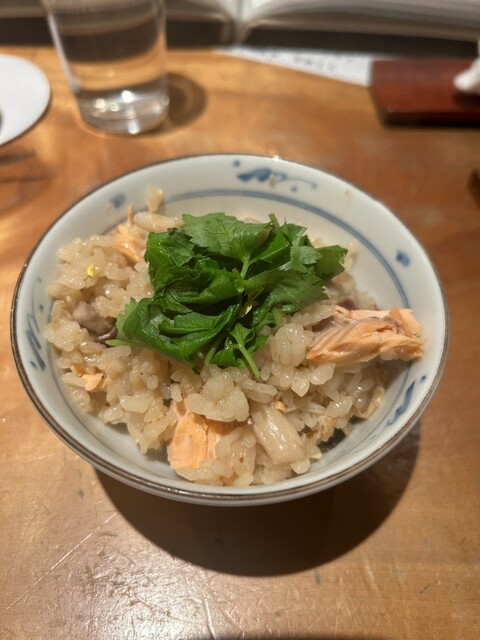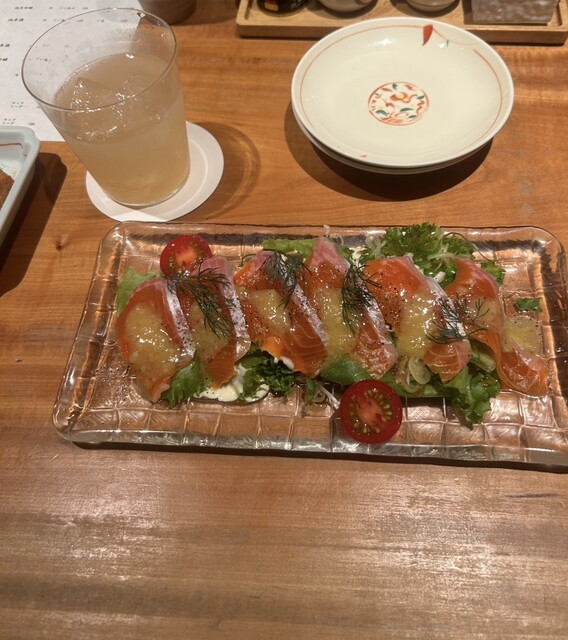 炊き込みご飯、サーモンのカルパッチョ、厚揚げ大葉、串揚げ(南蛮タルタル、カ...