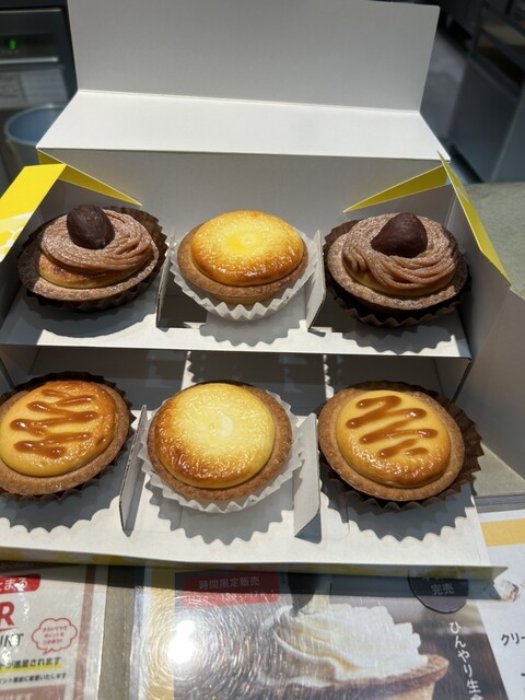秋の味のチーズタルトが並んでいて迷ってしまいましたが モンブラン、キャラメル2個、カマンベールを選び会計しようとしたら店員さんが「箱が6個入りになっているので2個空いてしまいます」と言われ、じゃあという事で抹茶とチョコレートを足して6個にしてもらいました
