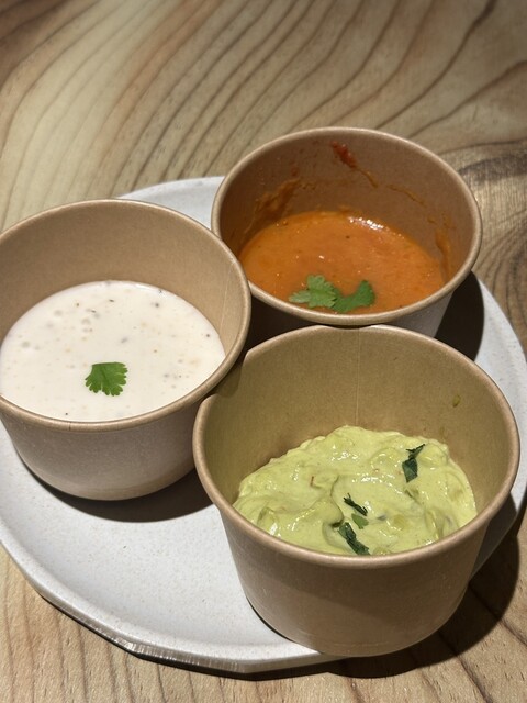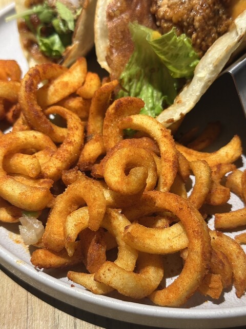 ビーフ、ポーク、チキンとタコス3種とカーリーポテト、ハニーレモンスカッシュと、ディップソースのワカモレとサルサピカンテを注文ꉂꉂ