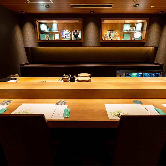 2021年2月オープンの店内は照明を抑えた落ち着いた雰囲気の総席数24席の小型店舗。