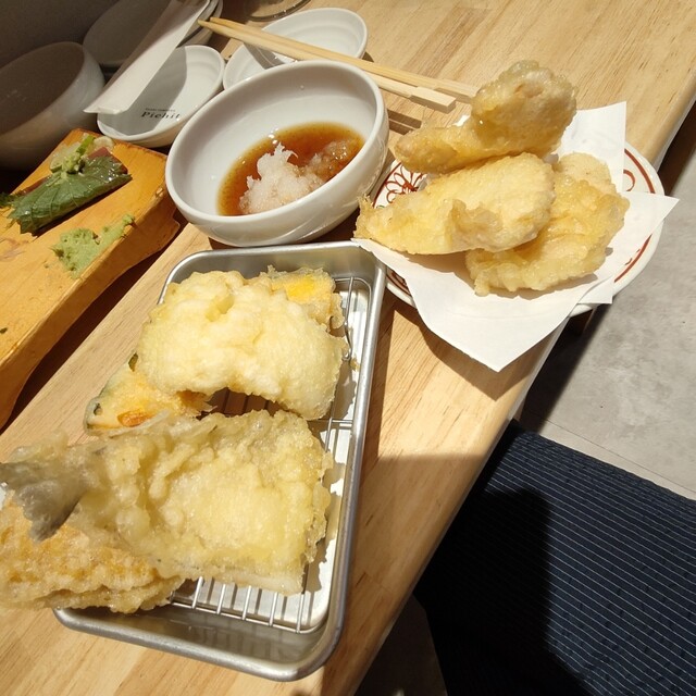 天ぷらが絶品の 『ぴち天』さん 特に天ぷらは衣がサクサクで、油っぽさを感じさせない軽やかさ。 素材の旨みをしっかり閉じ込めていて、 特大のアスパラ天も食べ応え抜群でした。 他にも、白魚大葉、とうもろこし、生ハムチーズ、 なども◎ トロサバは身がホクホクで程よい塩加減が最高◎ ... 詳細を見る