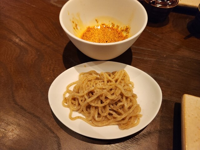 途中で出てきた よだれどりのタレを絡めて食べる山椒麺 は、今回のコースのハイライト。