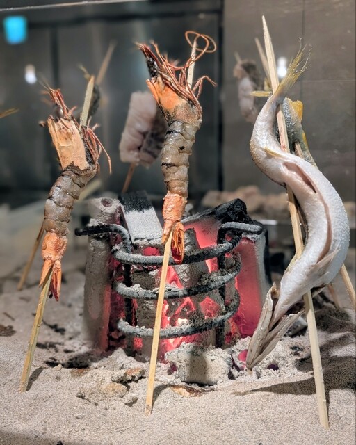 鮎や海老がじっくり炭火で火入れされていく姿は見応えがあり、香りも抜群。