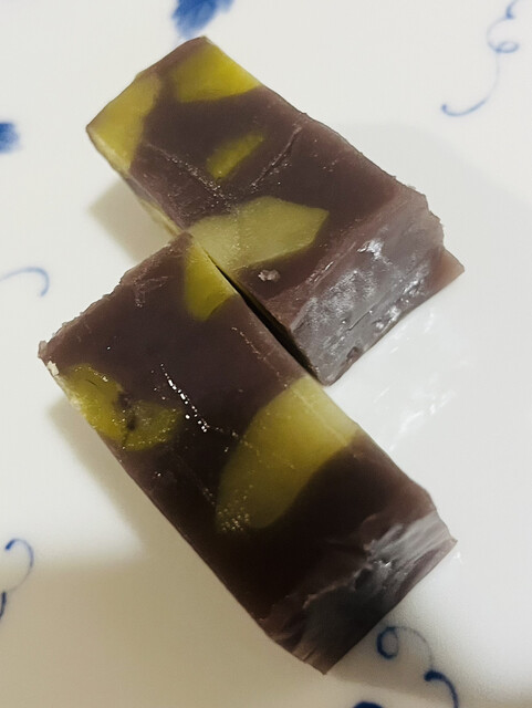栗蒸し羊羹は日もちするので、自宅でカットしいただきました。大きな栗がたくさん入っていて優しい甘味で美味しかったです。お茶うけに満点です。
