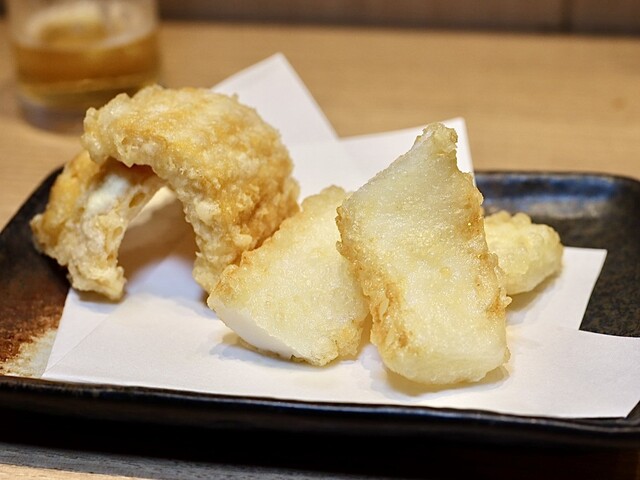 今回もエビに紅しょうが、ポテサラ、長芋、舞茸などいろんな種類の天ぷらをいただきましたが、火入れ加減が絶妙でしっかりと甘みが引き出されたエビにしっかりした刺激でお酒がススム紅しょうが、ほっこりした食感がたまらないポテサラなどどれも美味しくいただけました。