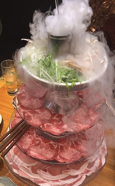 頼んだ料理はもちろん牛タンタワー盛り。お肉は3段あって、1番上は野菜。あと新商品の鴨鍋を注文。どちらもしゃぶしゃぶですね。