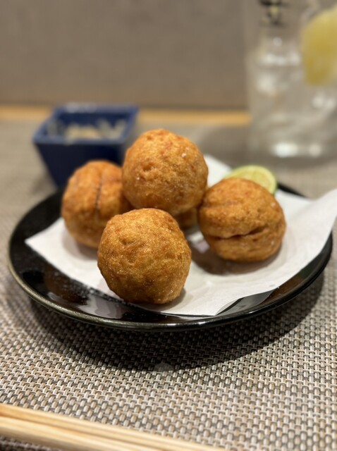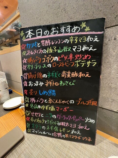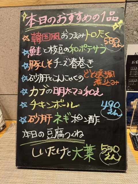 席に着くと、本日のおすすめの黒板を持って来てくれるので、その中から、鮭と枝豆の和ポテサラと、チキンボールをお願いする。