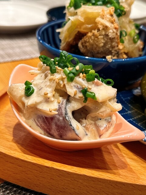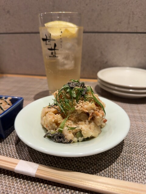 鮭と枝豆の和ポテサラは、普通は柔らかい鮭の味を入れると思いますが、カリッと焼いてある鮭が入っていて、もう食感で旨い。クセになる。