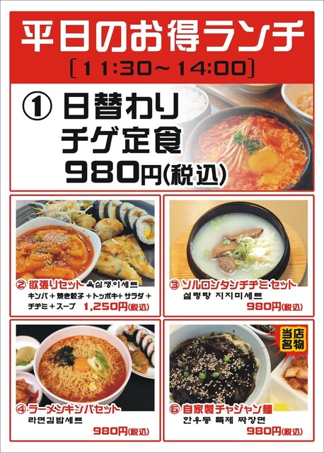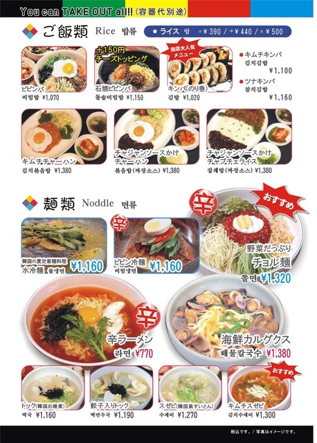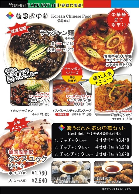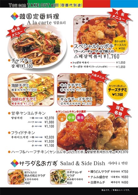韓国料理、韓国風中華がお手軽な値段で食べられる大衆食堂、テイクアウト専門。