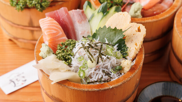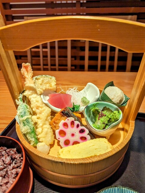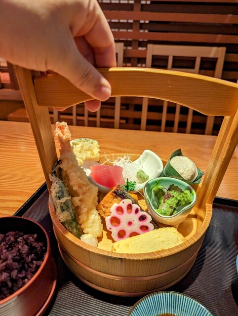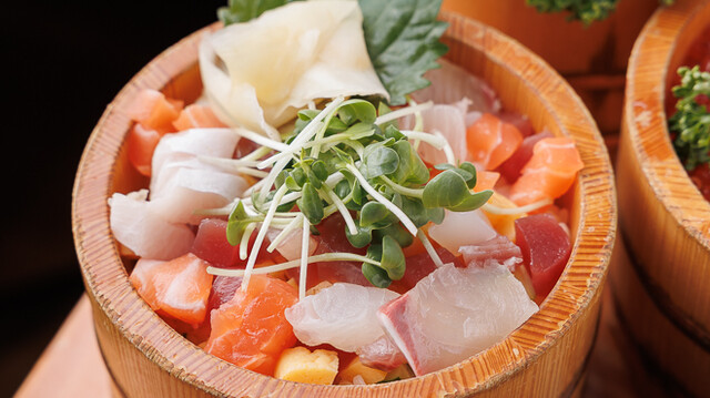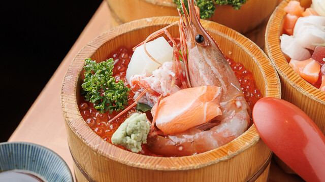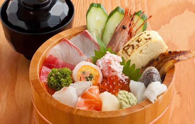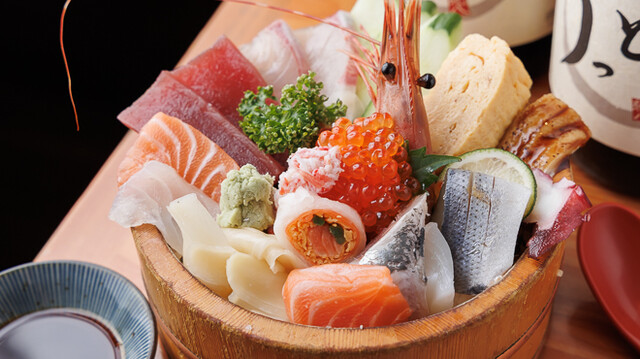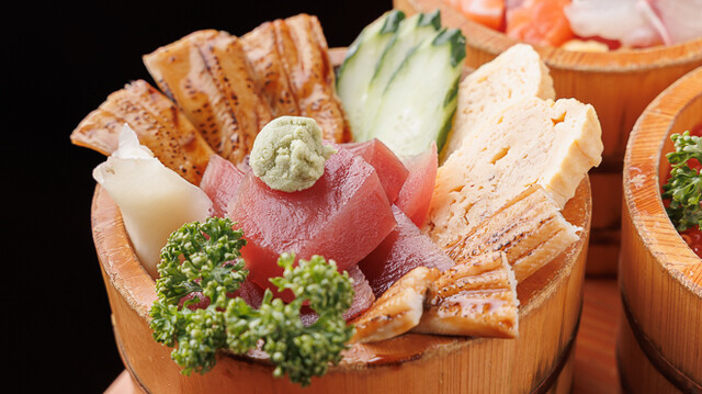 新鮮なお刺身や天ぷらなどが木の桶に盛り付けられて提供されます¨̮