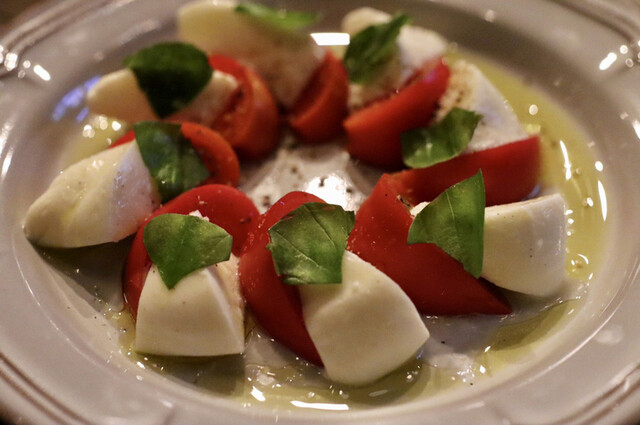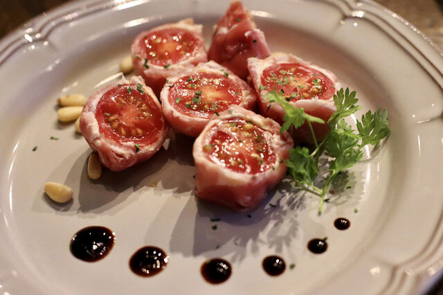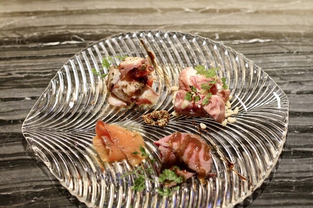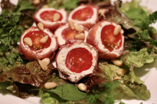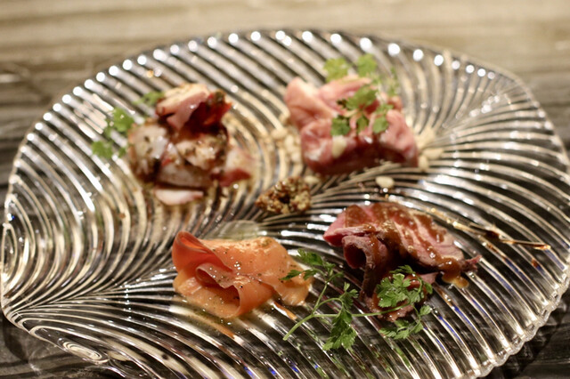 前菜の盛り合わせ(ハーフ)ローストビーフ、サーモンのカルパッチョ、タコとドライトマトのマリネ、マスカルポーネとトマトの生ハム包み