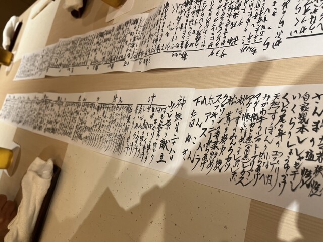 カウンターには季節の食材が並べられ、渡された日替わりメニューには一本の巻物くらいの紙に、これでもかというくらい料理が羅列されています。