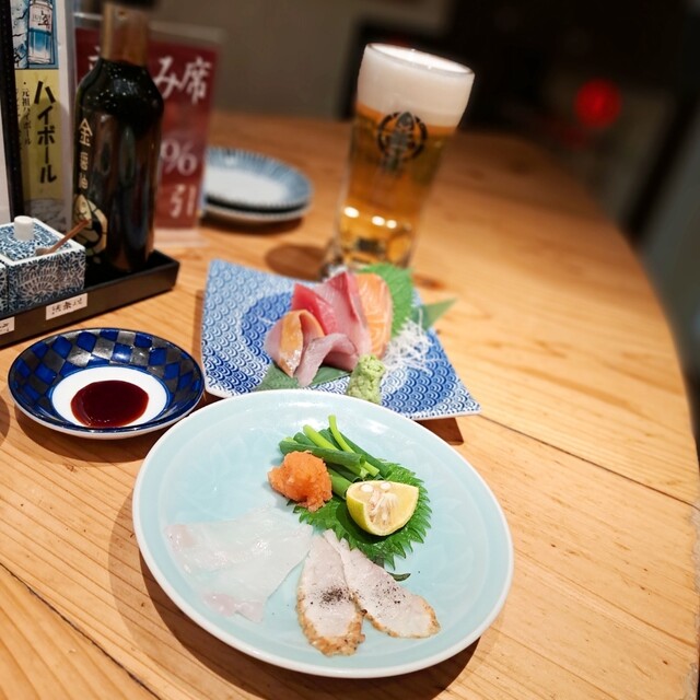 今日はみんなで飲み行こうか!って時にみんなを連れて来るには持って来いな、間違いの無い居酒屋さん! この日は、焼鳥屋さんで軽く飲んでからの2軒目利用でした。そんなに食べるつもりも無かったんですが、気になるメニューがたくさんあるんで頼んじゃいますよね〜! 結局、 名物のフグ刺身を3種 西京焼き 初めは、生ビール^^笑 次からハイボールを3杯位 あと、つくね的なのを頼みましたが... 詳細を見る