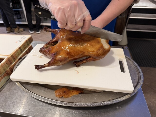 目の前で切り分ける。本場仕込みの北京ダック