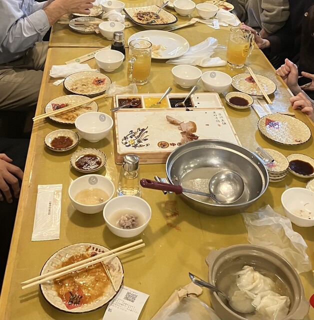 名物「北京ダック」は一羽丸ごと。余り肉のスープと炒め物付き。