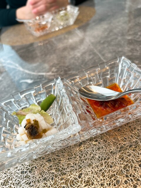 栄三越の交差点にあるBINOビル5階にあります。地下鉄なら栄駅の8番出口を出てすぐです。ランチで行きました。高級感のある店と聞いておりましたがその通りで良い雰囲気です。照明が暗くなるであろう夜ならより一層良いかもしれません。背もたれのクッションのおかげで椅子の座り心地がとても良いです。写真にも写っている凝った照明器具や、ずっしりとした大理石のテーブルも良いです。