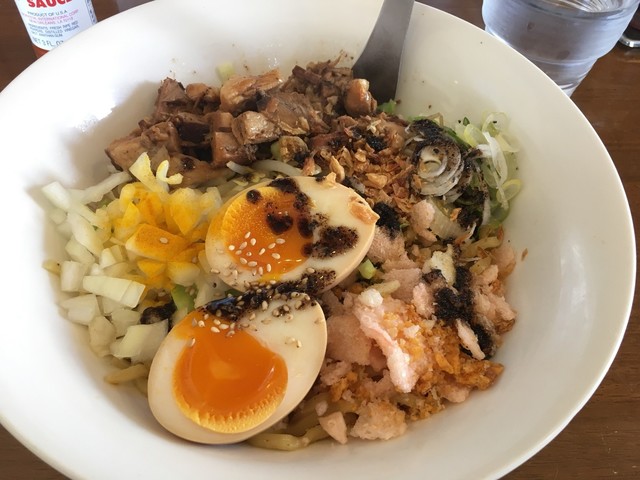 再訪 まぜそば 800円 食券を出す際にニンニクの有り無しを聞かれ、有りで注文。 広口で浅めの丼に、ほぐしたチャーシュー、半分に切った味付け玉子1個分、キャベツ、もやし、ネギ... 続きを読む»