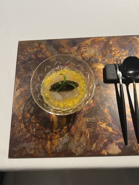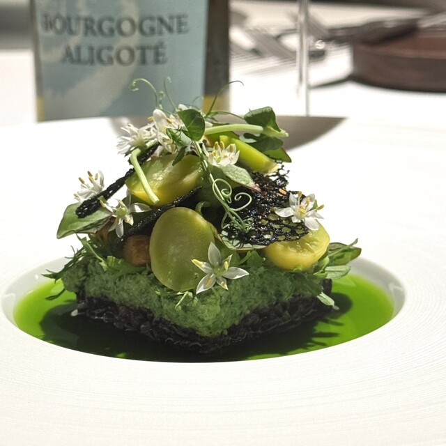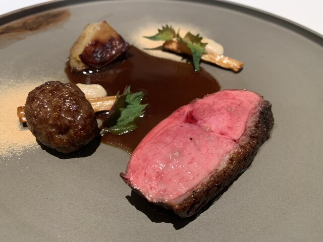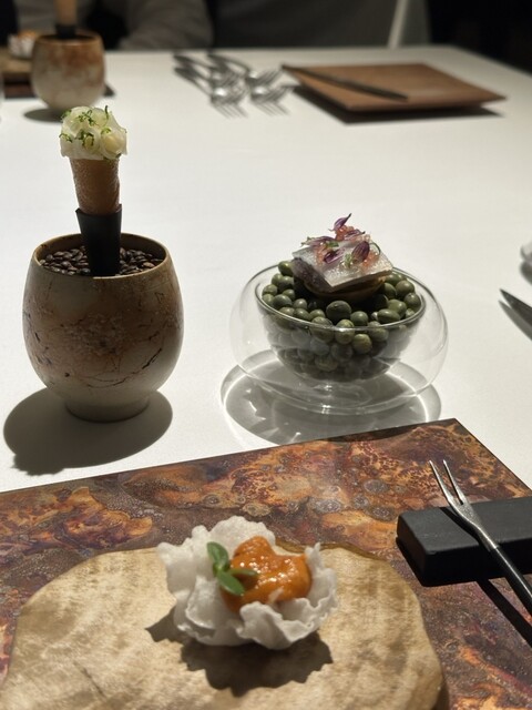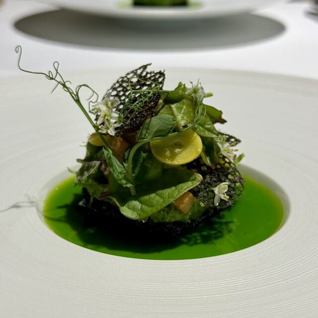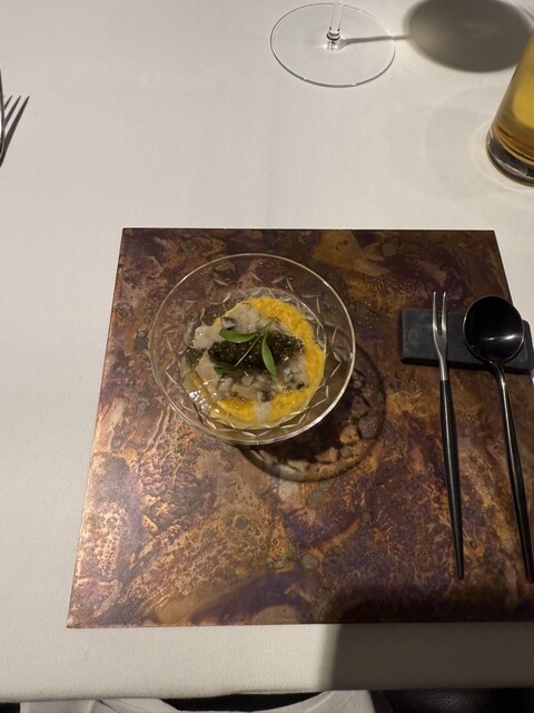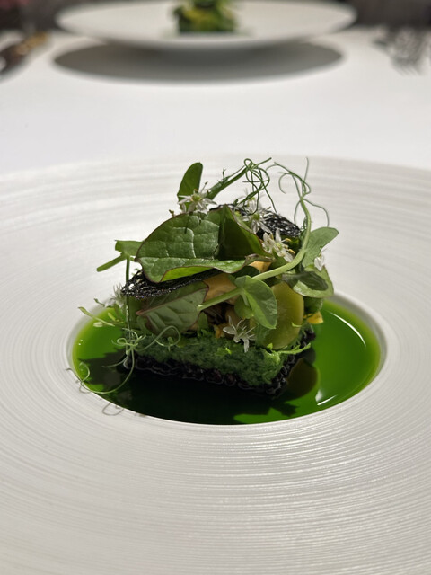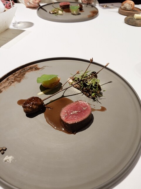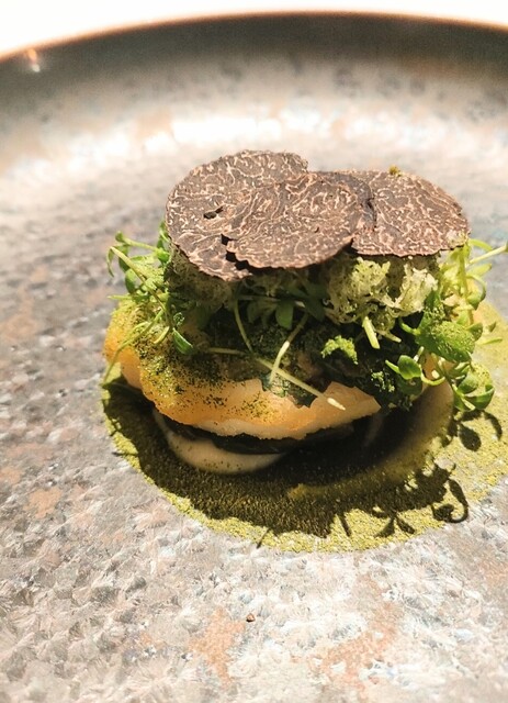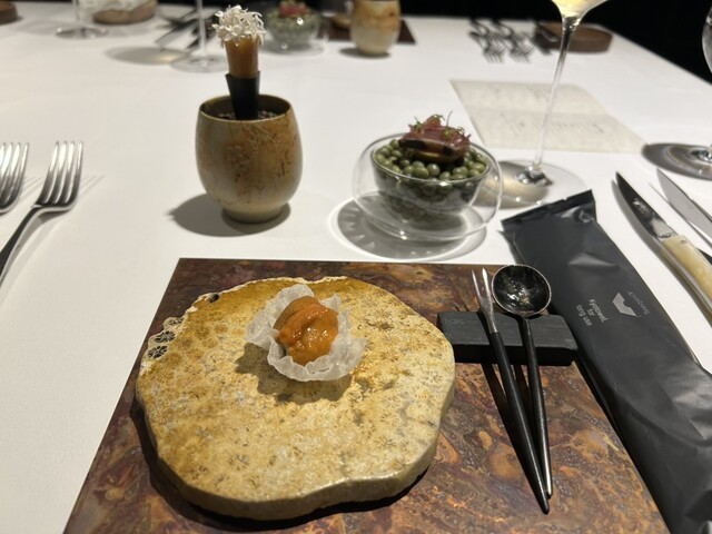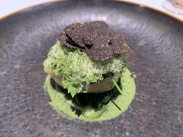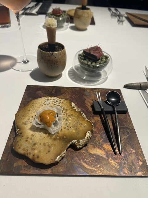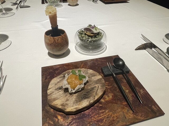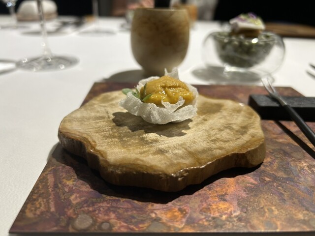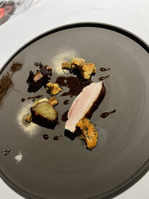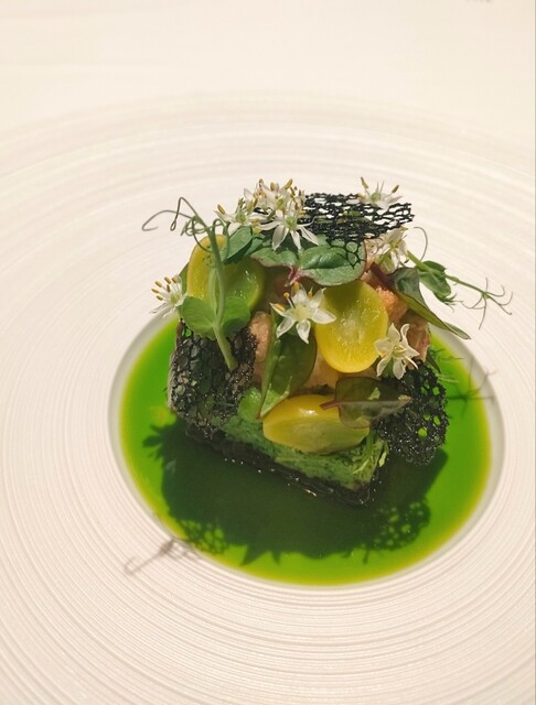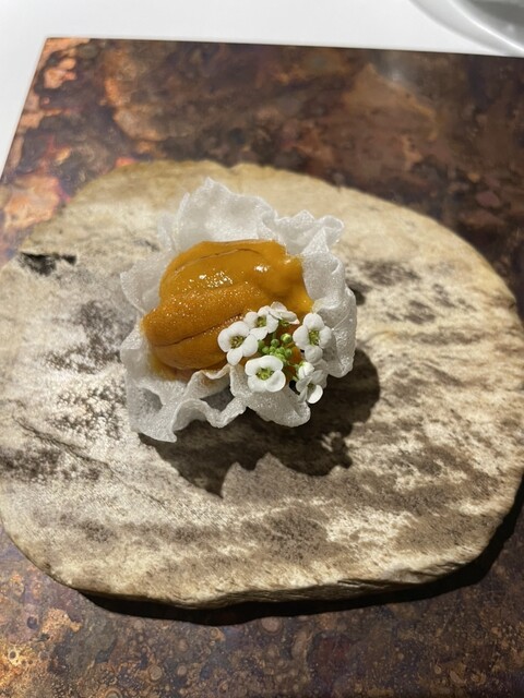 前菜のウニと猪の臭みが少々気になりましたが、フルーツの酸味と合わせるのはよかった。あとウニの温度はもう少し下げたほうが好みかな。花束みたいな前菜が1番お気に入り。この食用の花が苦いかなと思いきや、そん...