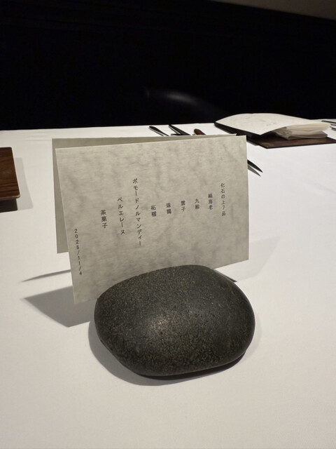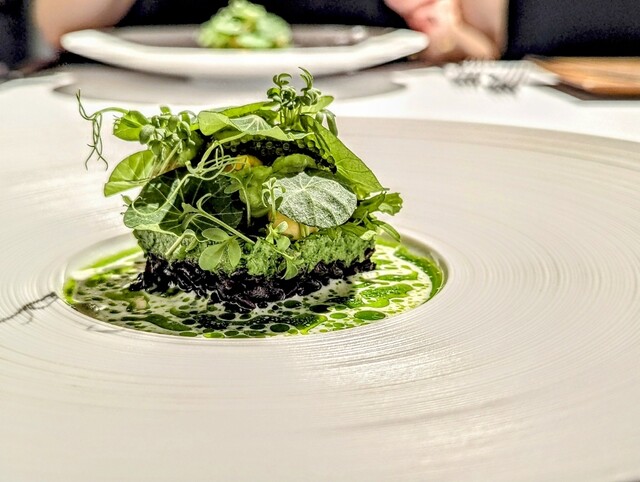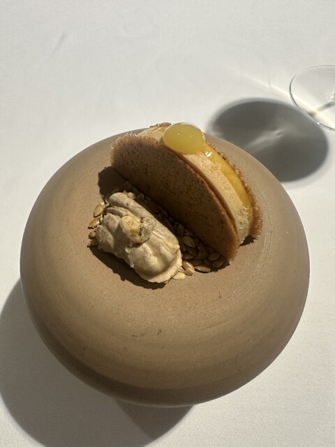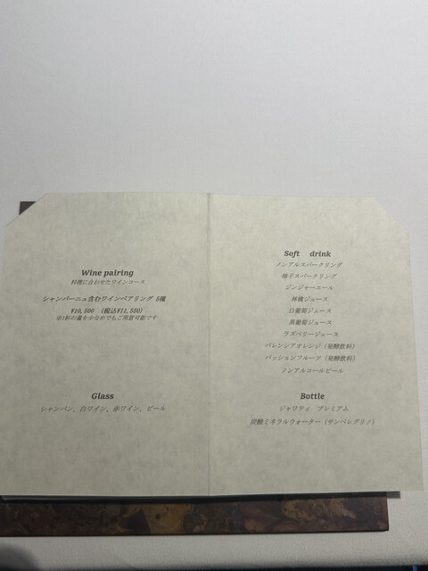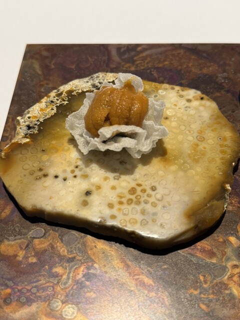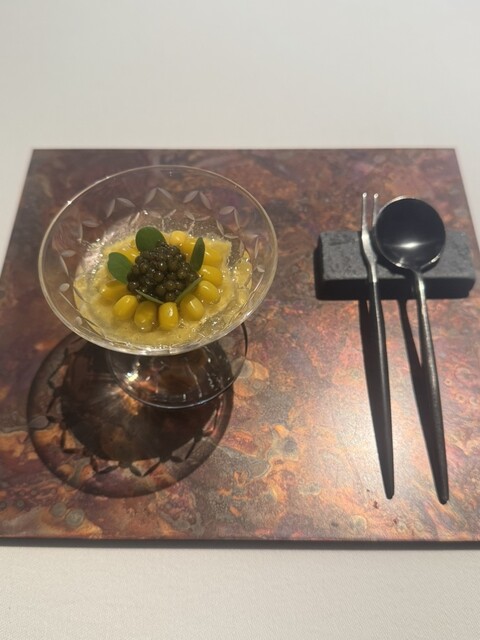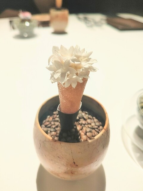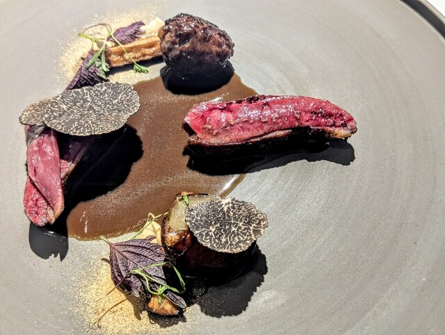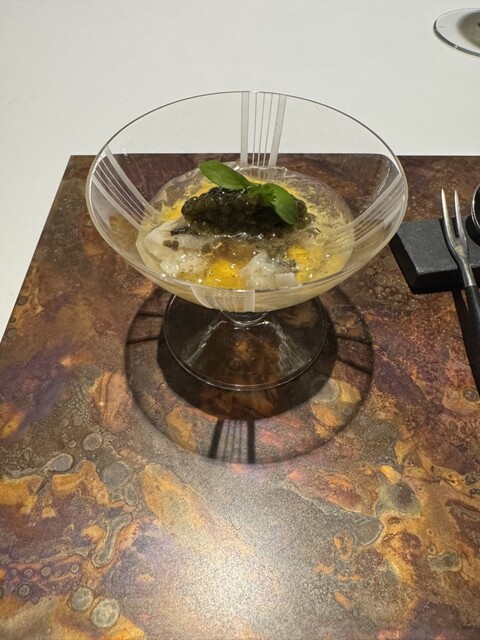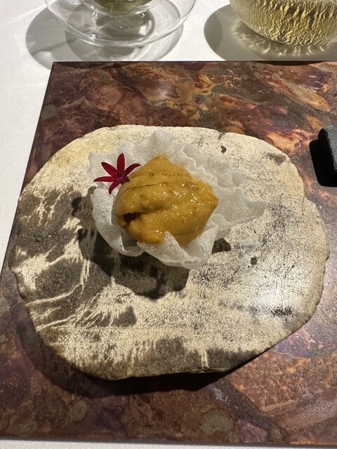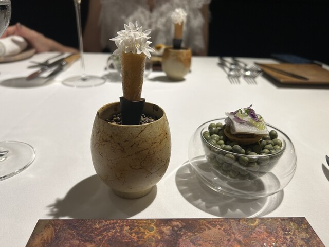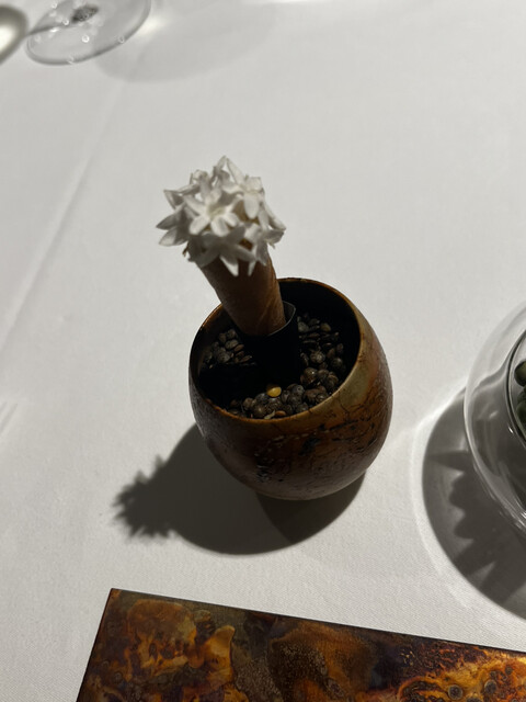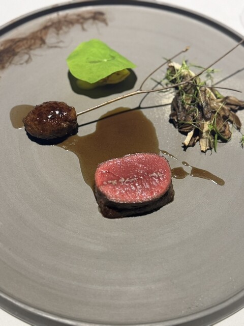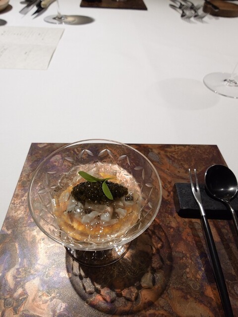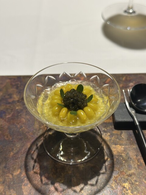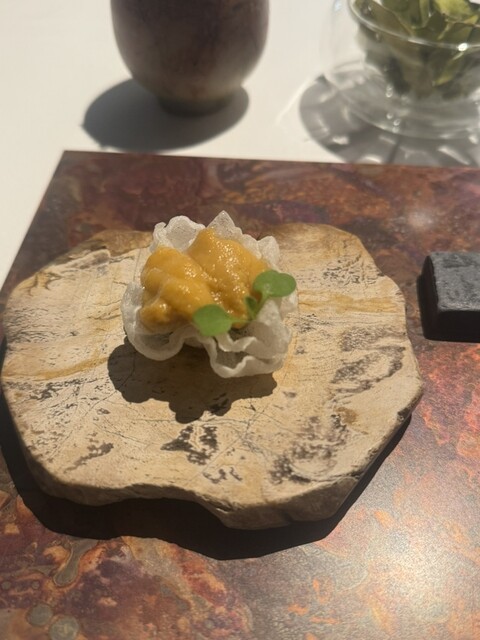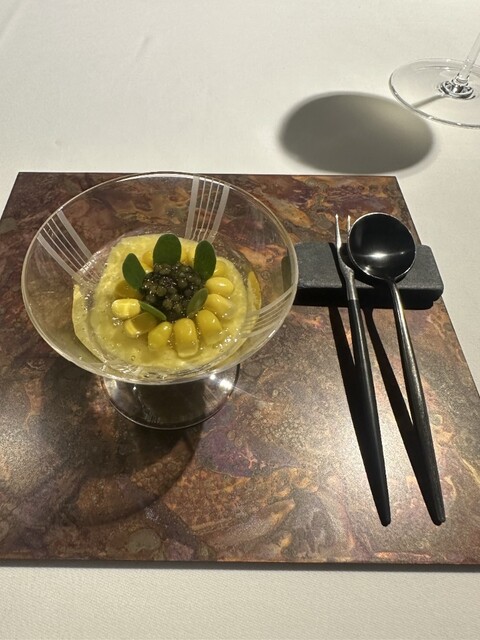 前菜のウニと猪の臭みが少々気になりましたが、フルーツの酸味と合わせるのはよかった。あとウニの温度はもう少し下げたほうが好みかな。花束みたいな前菜が1番お気に入り。この食用の花が苦いかなと思いきや、そん...