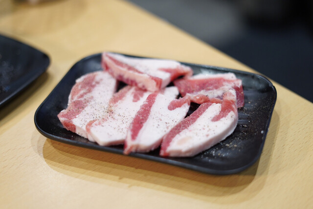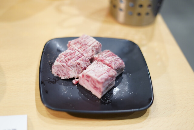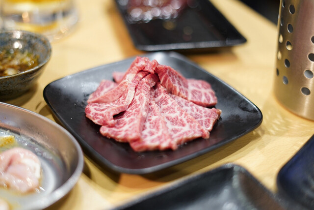 店入ってすぐ精肉が並ぶ冷蔵ショーケースがあり、そこを抜けると、上に換気口、ガスコンロ付きのテーブル席が幾つも並んでいた。