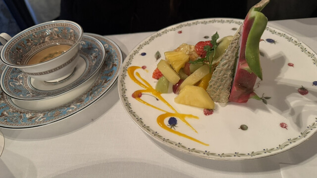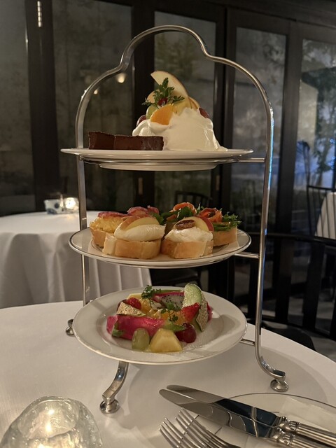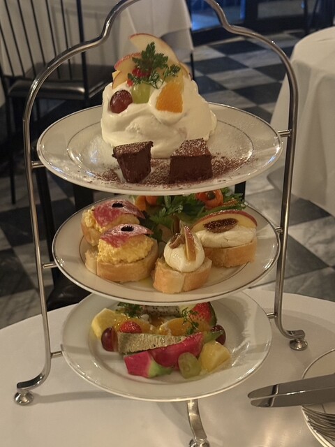 3段スタンドにはクロワッサンサンドをはじめ、マカロン、ロールケーキ、ガトーショコラ、ミニエクレアなどがバランスよく並び、甘いもの一辺倒にならない構成が好印象。どれも派手さよりも丁...
