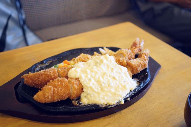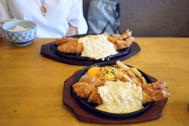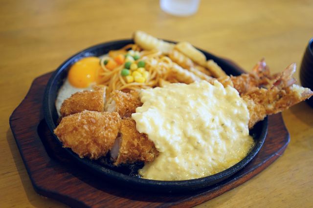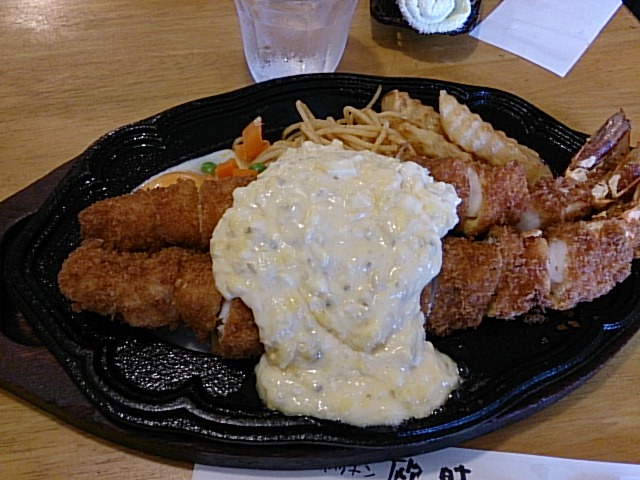 先日TVの『デララバ』を観てジャンボ海老フライのビジュアルに釘付け!直径25cmの海老フライは予想以上にボリューミーでした♪ ◆ジャンボ海老フライ定食 2800円 鉄板の上には… ・ジャンボ海老フライが2本 ・目玉焼き ・ミックスベジタブル ・ケチャップスパゲッティ ・ギザ... 詳細を見る