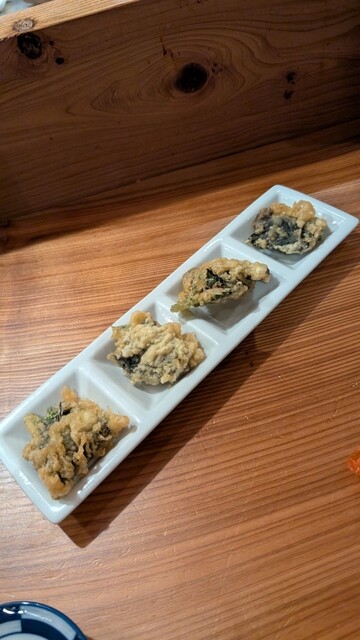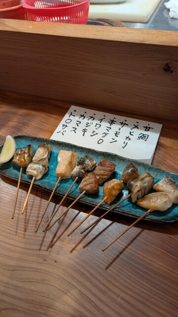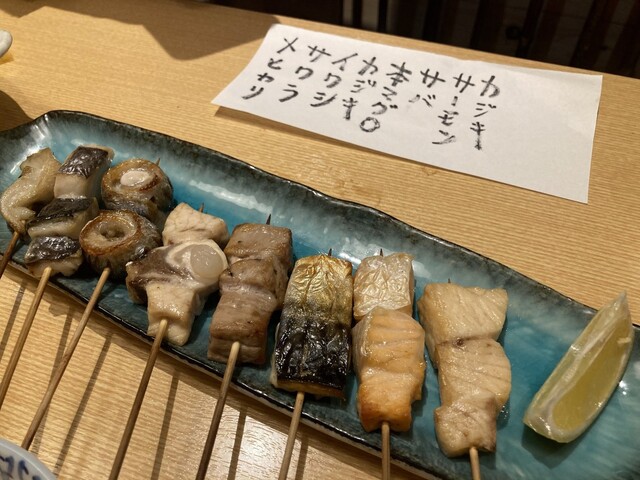 おふろの名物料理2品を盛り込んだコース料理です。 イカの肝焼きは、来店される7割のお客様が注文されているくせになる味です。魚の串焼きは、最近の一推しです。 殆どのお料理をお一人様ごとに分けて提供させて頂いています。
