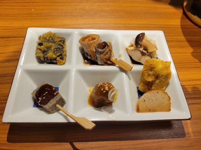 ◾️おふろの名物料理2品を盛り込んだコース料理です。 イカの肝焼きは、来店される7割のお客様が注文されているくせになる味です。魚の串焼きは、最近の一推しです。 殆どのお料理をお一人様ごとに分けて提供させて頂いています。