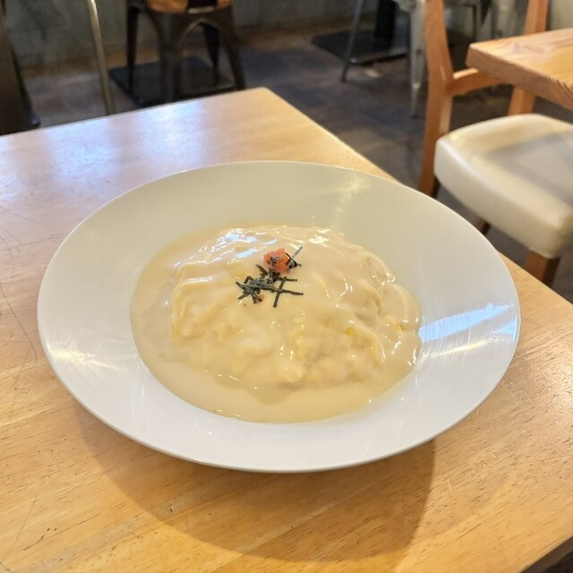 玉子の中は明太子ミンチライスで、ホワイトソースがかかっています。