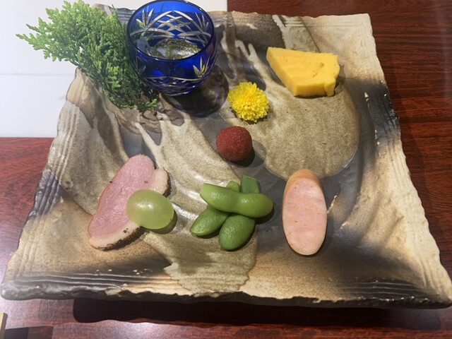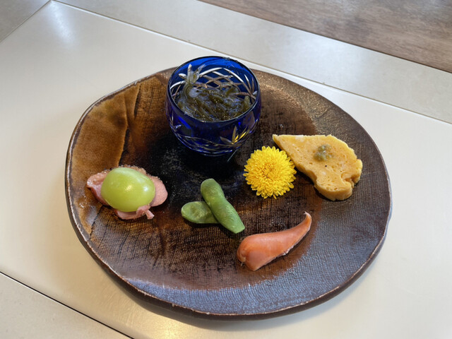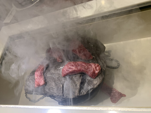 850度の高温で熱した石で焼くこだわりの石焼料理を召し上がって下さい。 季節の食材をいろいろ使った、お口取り。 石焼ステーキは、黒毛和牛の雌を,ドライエイジングしたサーロインで、 芳醇な香りとともに、お肉本来の「これがお肉のうまさだ」と実感できます。 ご飯も、白米飯、大葉と煎り胡麻、刻み海苔をトッピングした紫蘇ご飯、和牛筋をじっくり煮込んだ牛筋カレー、紫蘇ご飯と和牛筋カレーのハーフ&ハーフの4種類の中から お選びいただけます。 飲み放題にした場合のワインは、ボトルでもお出しできます。