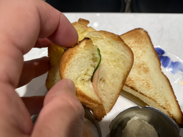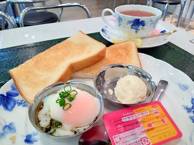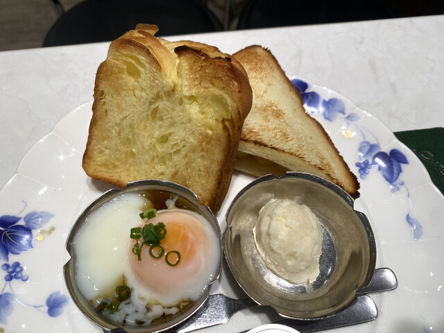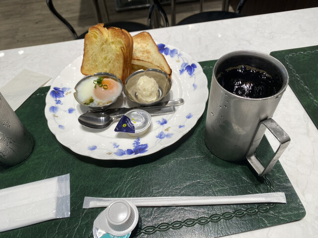 「Aセット」550円をアイスコーヒーで注文。以前はモーニングセットと呼ばれていたが、今はただのセットメニューに。トーストにポテトサラダ、温泉玉子がついているのは昔から変わらない。病院が改装して場所は変わったが銀の器や内容は昔から変わってない。ただ、だいぶ値上げしましたけどね。