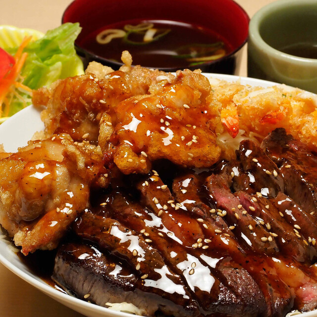 ランチで人気のステーキ丼を夜ご飯でも提供開始◎チャレンジ必須!衝撃の名物『デカ盛り』!!