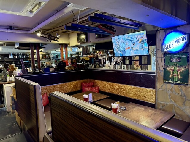入ってすぐのカウンター席のほか、奥にはテーブル席のホールが配されたアメカジ風の店内。かなり使い込まれていますが、そこそこ広い上に、テーブルの間をシェードで仕切るなどプライベート感にも配慮されています。
