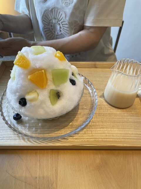 氷はふわふわで、暑い夏にぴったりです。フルーツも甘くてフレッシュです。練乳もたっぷりで最後は少し残ったくらいです。