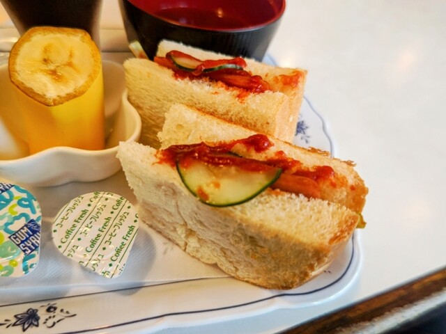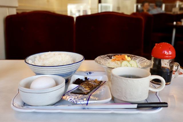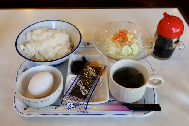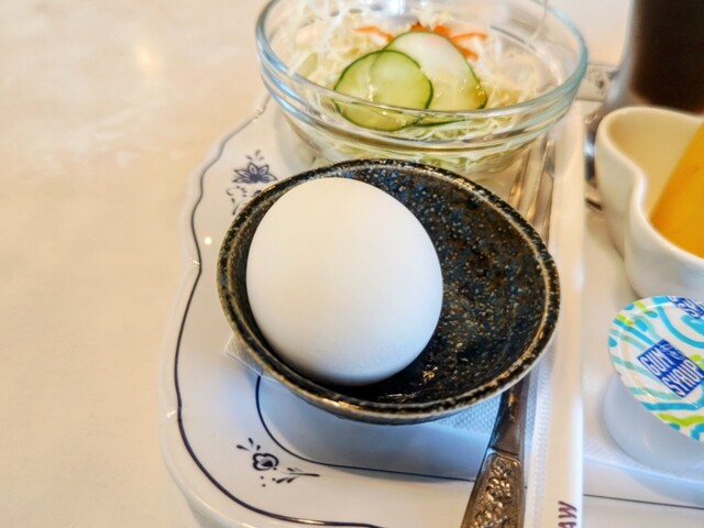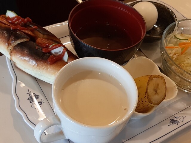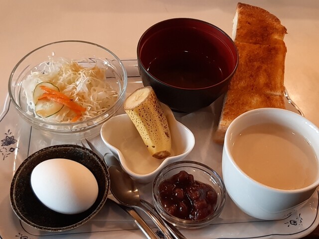 トースト、小倉あん、ゆで玉子、サラダ、汁物と結構豪華なラインナップ。