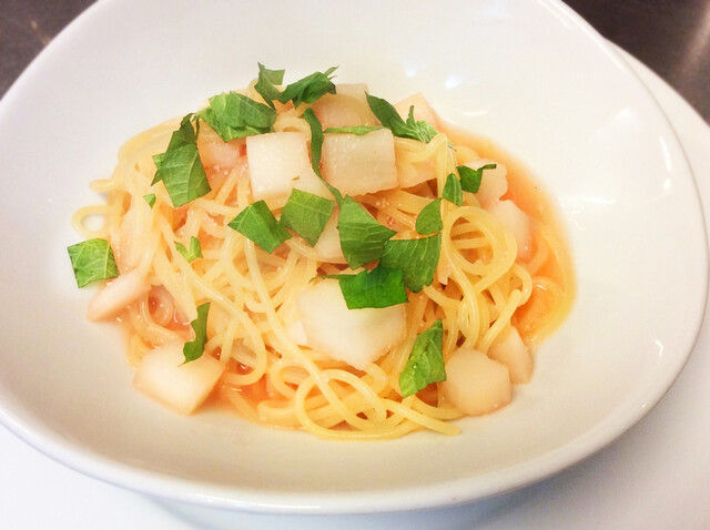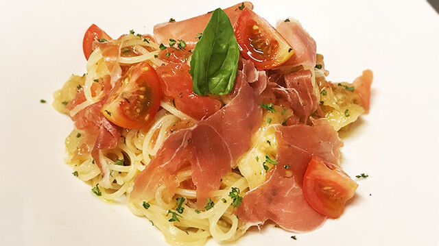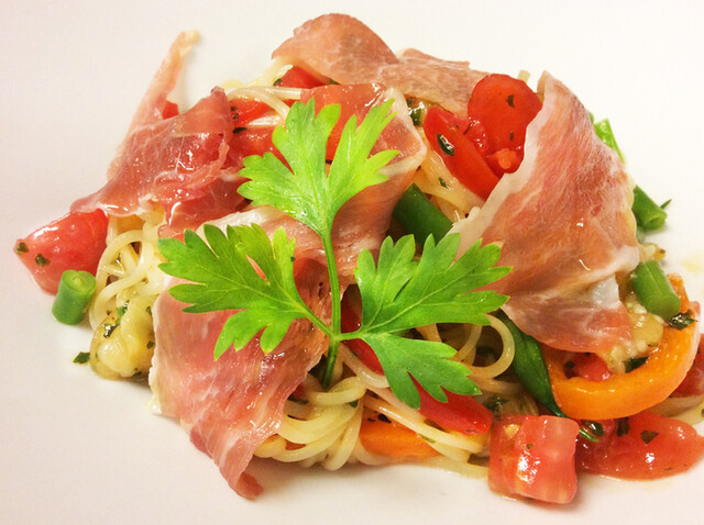 焼き茄子と生ハムの冷製パスタ (by お店)