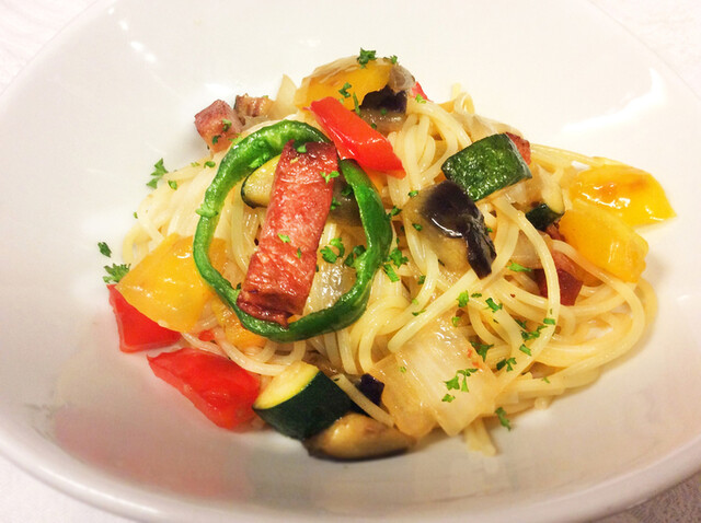 厚切りベーコンと夏野菜のペペロンチーノ (by お店)