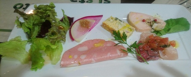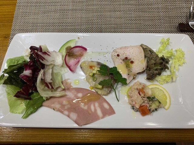 スタッフのおすすめに従い、前菜盛り合わせを2人分、パスタ、メインを一つずつオーダーしてシェアすることにしました。