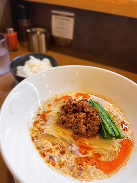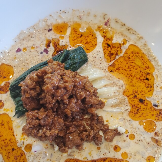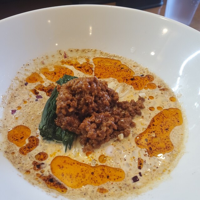 胡麻と豆乳、花椒と肉味噌に青菜で鮮やかな一杯。