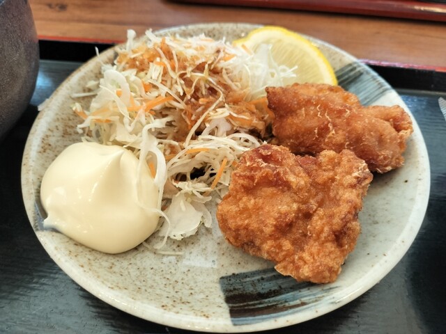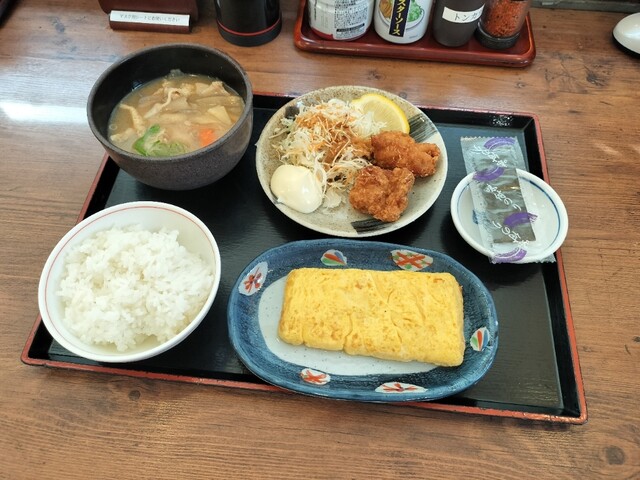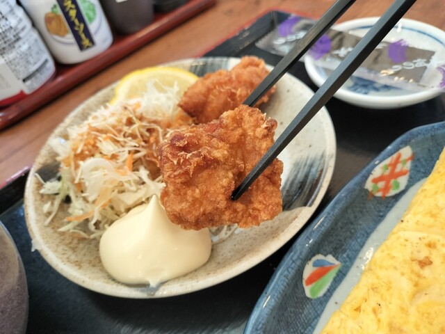 名古屋市中川区にある定食店、平日の7時頃に朝食目的での訪問。 このメニューを券売機で注文し、カウンター席で頂く。 ★ 若鶏唐揚げとだし玉子焼きの朝定食 650円 ★ ... 詳細を見る
