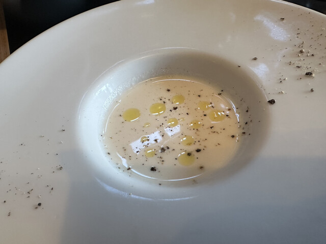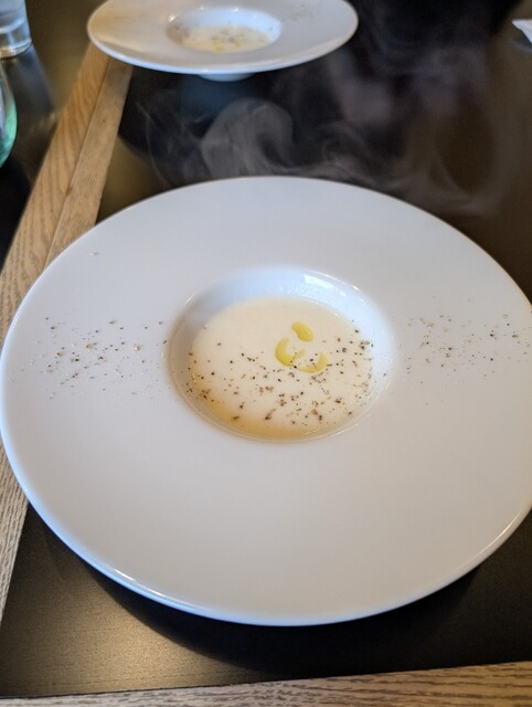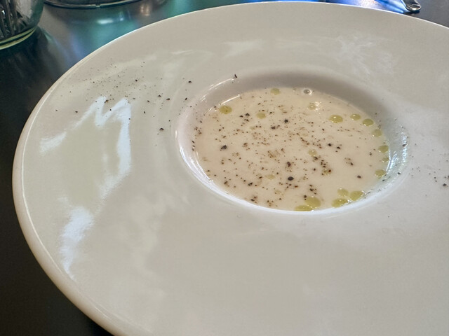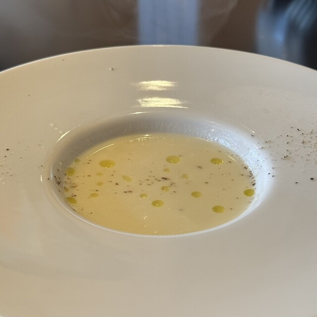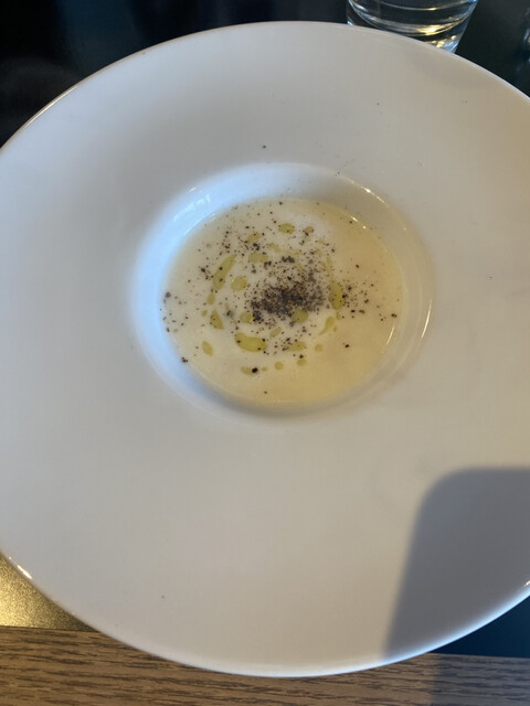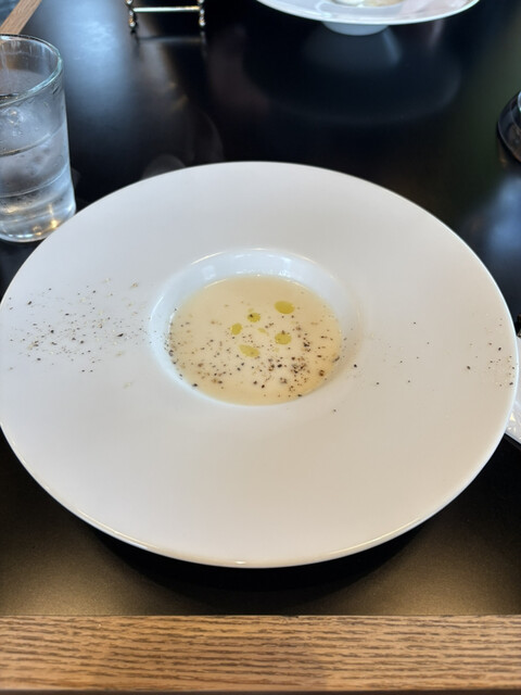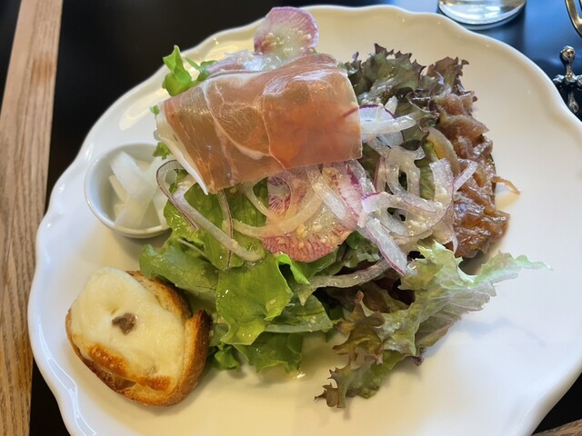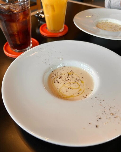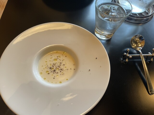 まず冷製スープから始まりワンプレートのサラダ。