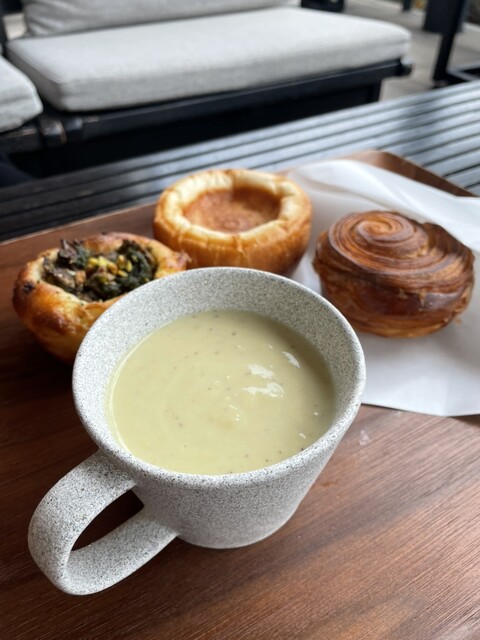 7月5日金曜日12時頃 知人からの評判が良く、訪れてみたかったのですがなかなか機会がなく、今回やっと行くことが出来ました! 店内に入ると数々の美しいパンといい香りが(ˊᵕˋ).。oO デニッシュ系から食パン、サンドウィッチ、バスクチーズケーキが販売されてました。 パンは小ぶりな物が多... 詳細を見る