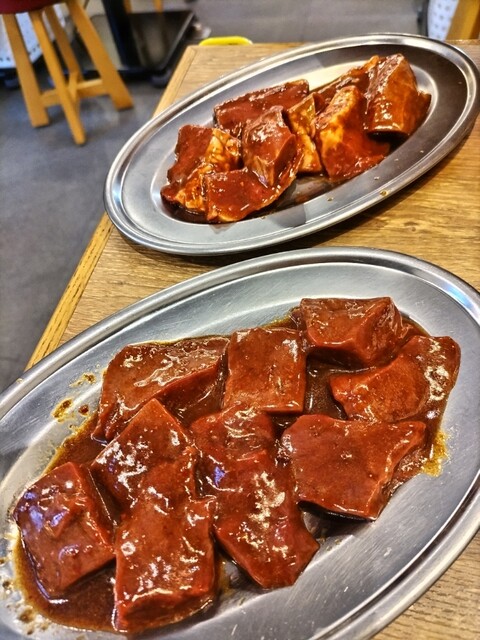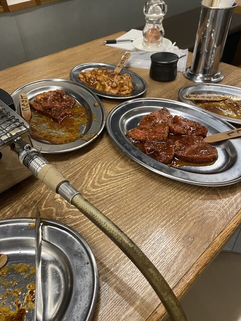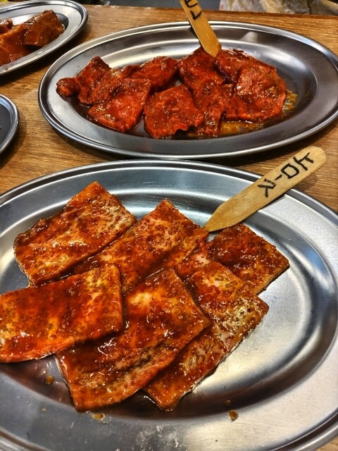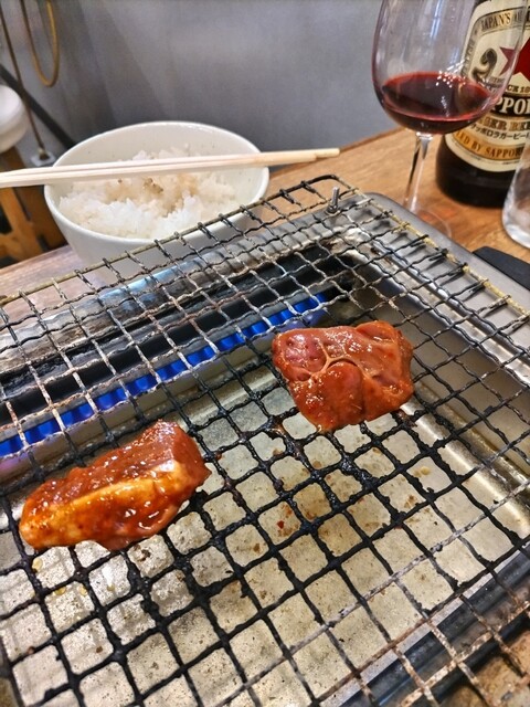 螺旋階段で2階へ上がり、店内はゆったりした広さ、テーブルに置かれたガスロースターで焼く煙モクモク系で、黒毛和種や豚は味噌ベースでニンニクのきいた “秘伝のタレ” にしっかり漬け込まれ、ヒレやロースは柔らかく懐かしの焼肉が頂けました。