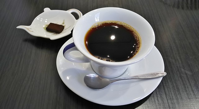 珈琲・春風ブレンド(440円)、抹茶シフォンケーキ(280円)にします。珈琲には、茶菓子としてショコラテリーヌが付いてきます。