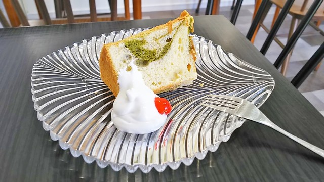 抹茶シフォンケーキは、濃いめの抹茶を含めたマーブルタイプのものです。抹茶特有の香り豊かなほろ苦さと生地そのもののふんわりした甘みが心地良いシフォンケーキです。