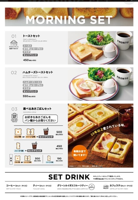 トースト、サラダ、ゆで卵orヨーグルト、ドリンクで税込450円っ...